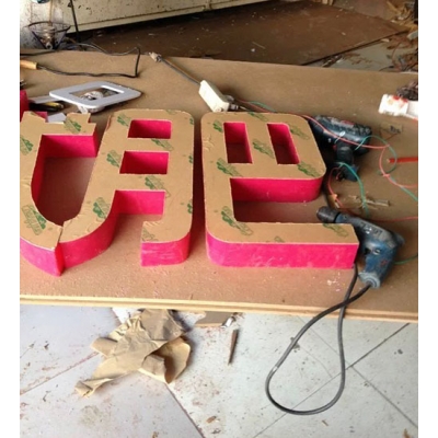 吸塑字也是一种发光字,板面通常使用亚克力板吸塑成型,再由底座等组合而成。其内部置入LED灯或是高压灯,表面工艺有平面、平鼓、球鼓、棱鼓等形式,箱体材料有铁皮烤漆、铝型材、不锈钢、钛金等,字面色彩既可以是固有色板,也可以是专色或四色丝印。
